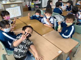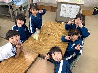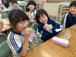 6日(木)の第4時限に、1年生が生活科で取り組んだサツマイモを育てる活動のまとめとして、各学級で茶巾絞りを作りました。サツマイモの甘い香りが漂う中、子ども達は蒸されたサツマイモをラップで包んで丸くして、おいしくいただきました。